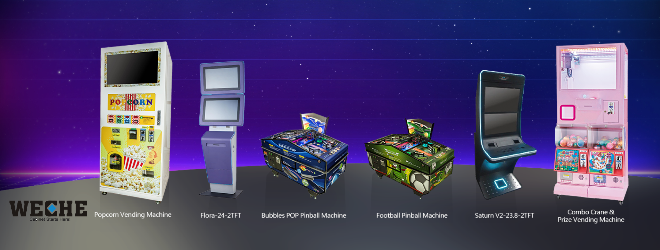 Wee Chin Electric Machinery Inc., WECHE, devotes to R&D and manufacture Gaming & Amusement Cabinets since 1980, including Casino, Arcade, Entertaining, Information, Vending Machine Cabinets, Change Machine as well as Crane & Gift Machines, Redemption Machines, Air Hokey Table Machines, Pop Corn Machines, now even the cabinet of Automated External Defibrillator (AED).
