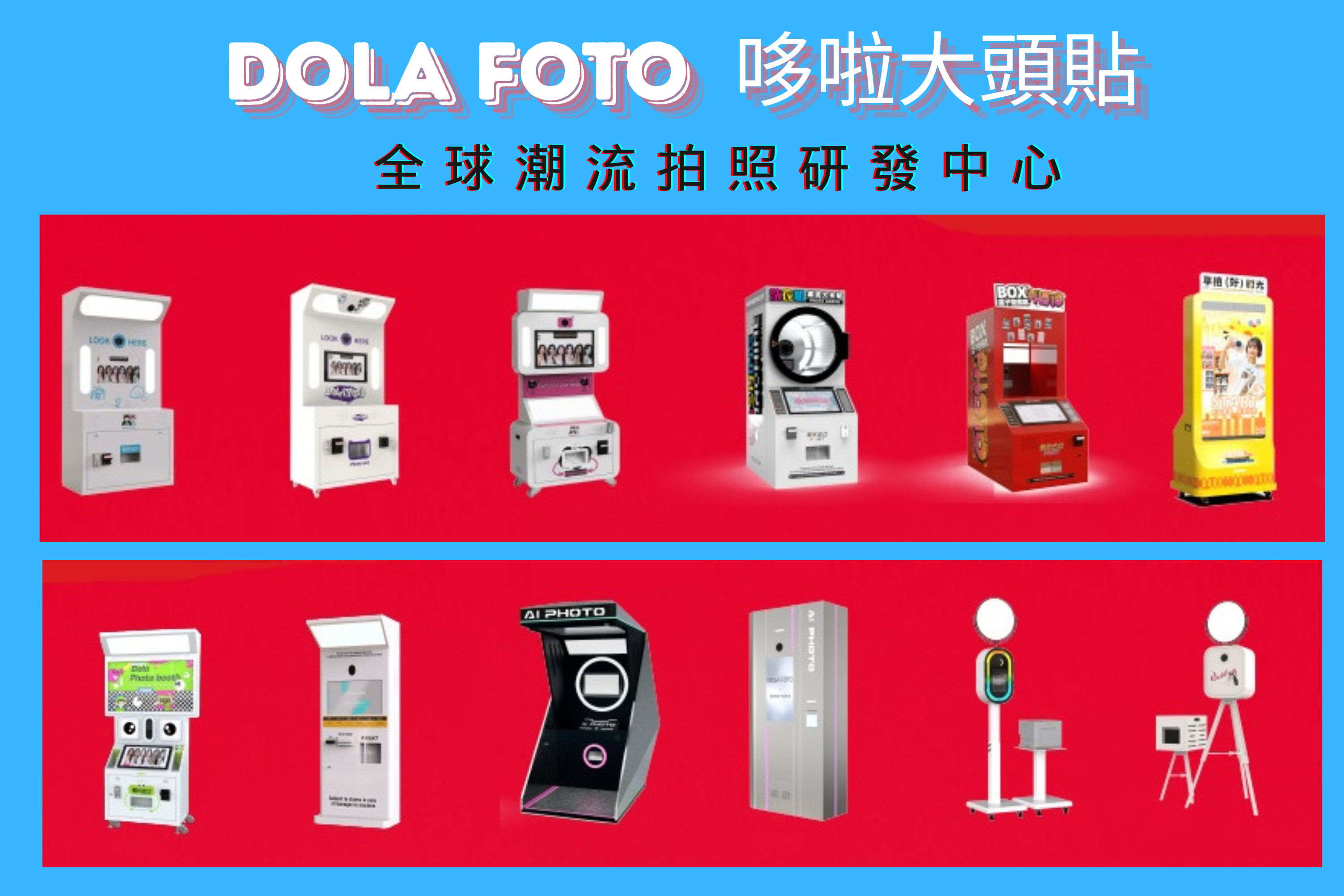 公司產品分為6大系列共計30+款拍照機產品。包含場景拍攝系列、AI拍照機系列、大頭貼系列、潮流新玩法系列、魔鏡系列、互動拍照機系列,集潮流、文化、藝術、娛樂、科技為一體,為消費者帶來更多更好的大頭貼產品。覆蓋全球市面上所有風格的拍照機產品。